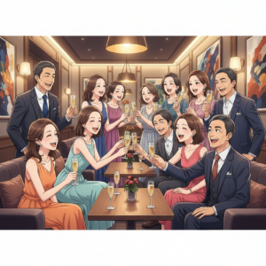 ミモザが選ぶ会場は、常に「大人の社交場」としての品格が保たれています。騒がしい居酒屋やクラブではなく、静かに会話が楽しめるホテルのラウンジやレストランが中心です。